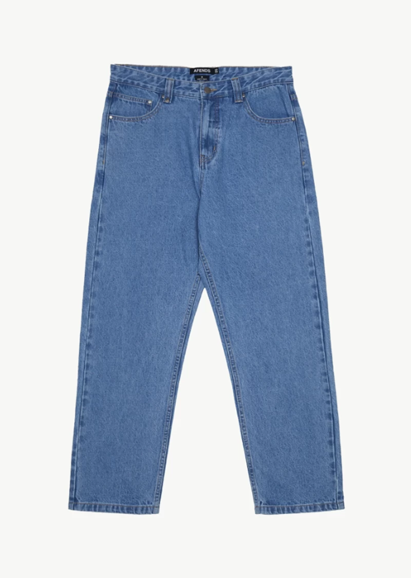 Afends denim jeans give a nod to the 90s. Offering a mid-rise, relaxed fitting straight leg cut, the Ninety Twos are an essential wardrobe staple. With the innovative blend of midweight eco-friendly recycled cotton and hemp denim in our signature vintage washes, these jeans will continue to define your everyday collection.