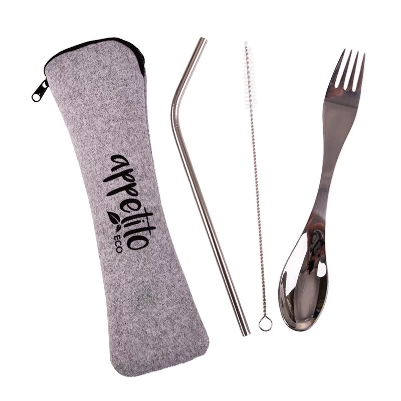 Made from stainless steel, this quality set includes a spork, drinking straw and cleaning brush. It all comes in a handy neoprene travel pouch, perfect for storing in your handbag, manbag, backpack or glove box.