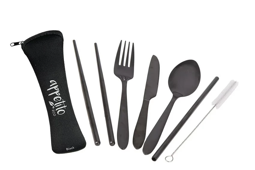 Perfect for picnics, work lunches, and more, this Appetito 6 Piece Stainless Steel Travellers Cutlery Set. This set features a fork, a pair of chopsticks, a spoon, a straw, a knife, and a straw brush all held securely together in style in a neoprene case. Easy to take on the move with you and made from stainless steel, this lovely rose gold cutlery set is also conveniently safe to use in the dishwasher.