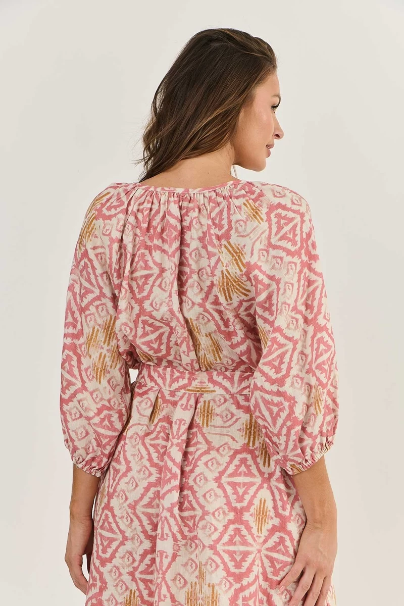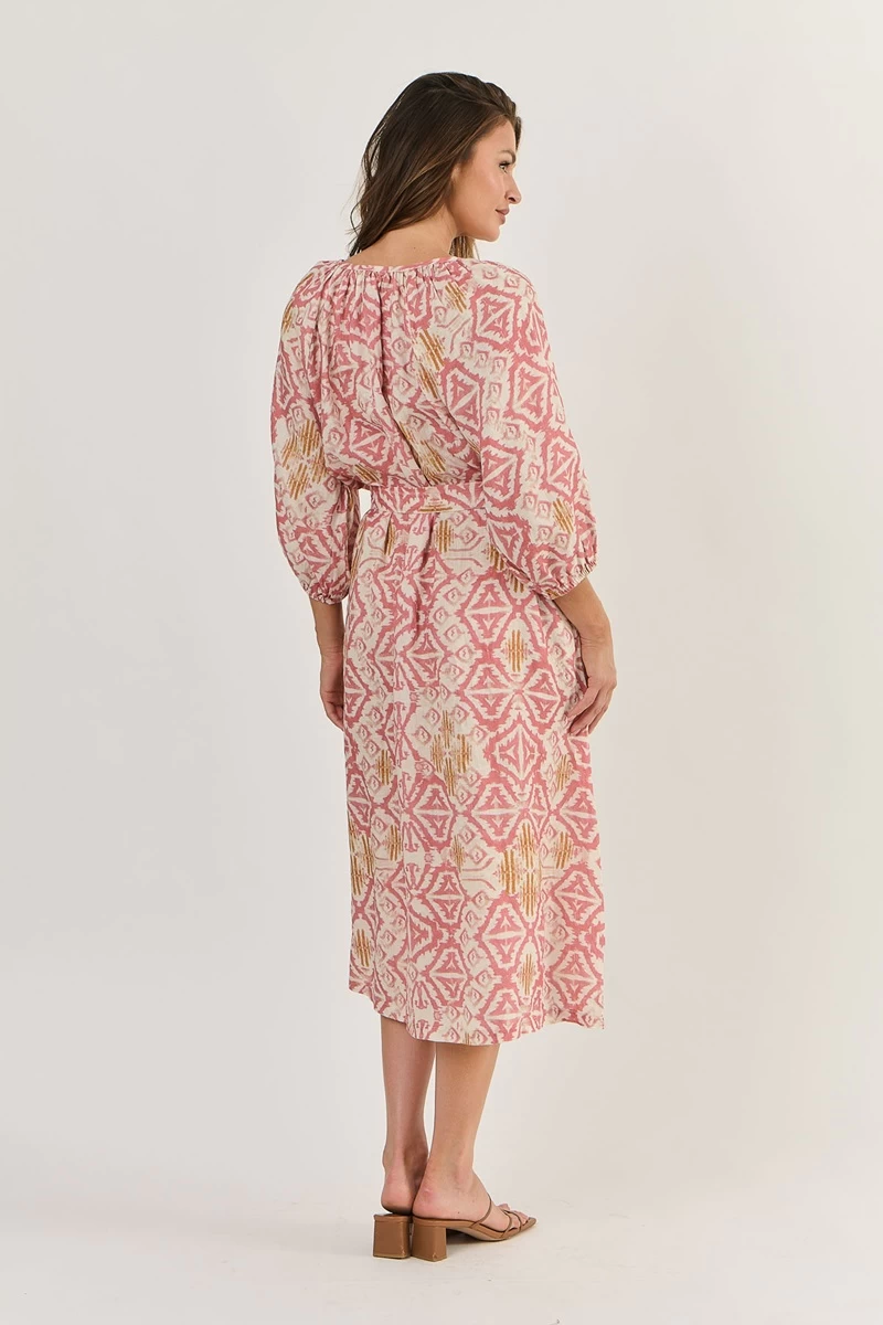 Casual elegance emanates from the GA534. Delicate gathering leads into a V-neck, beautiful bishop sleeves end below the elbow. A waist tie gives definition to the shape of the dress and the hem reaches to the mid-shin. The two side pockets are a wonderful addition to any item. Made from 100% linen. The model is 175cm tall and wears a size S equivalent to a size 10.