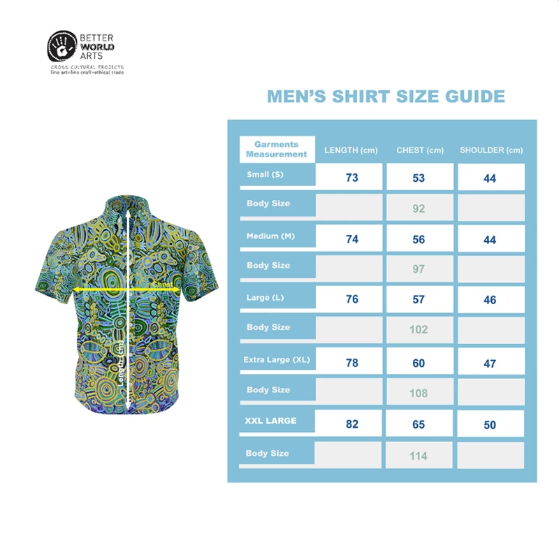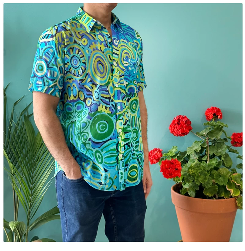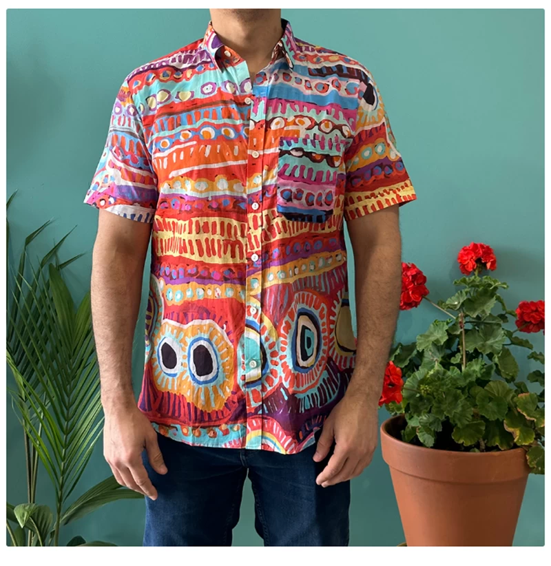 Better World Arts Cotton Voile short sleeve shirt featuring original art works from indigenous artists.