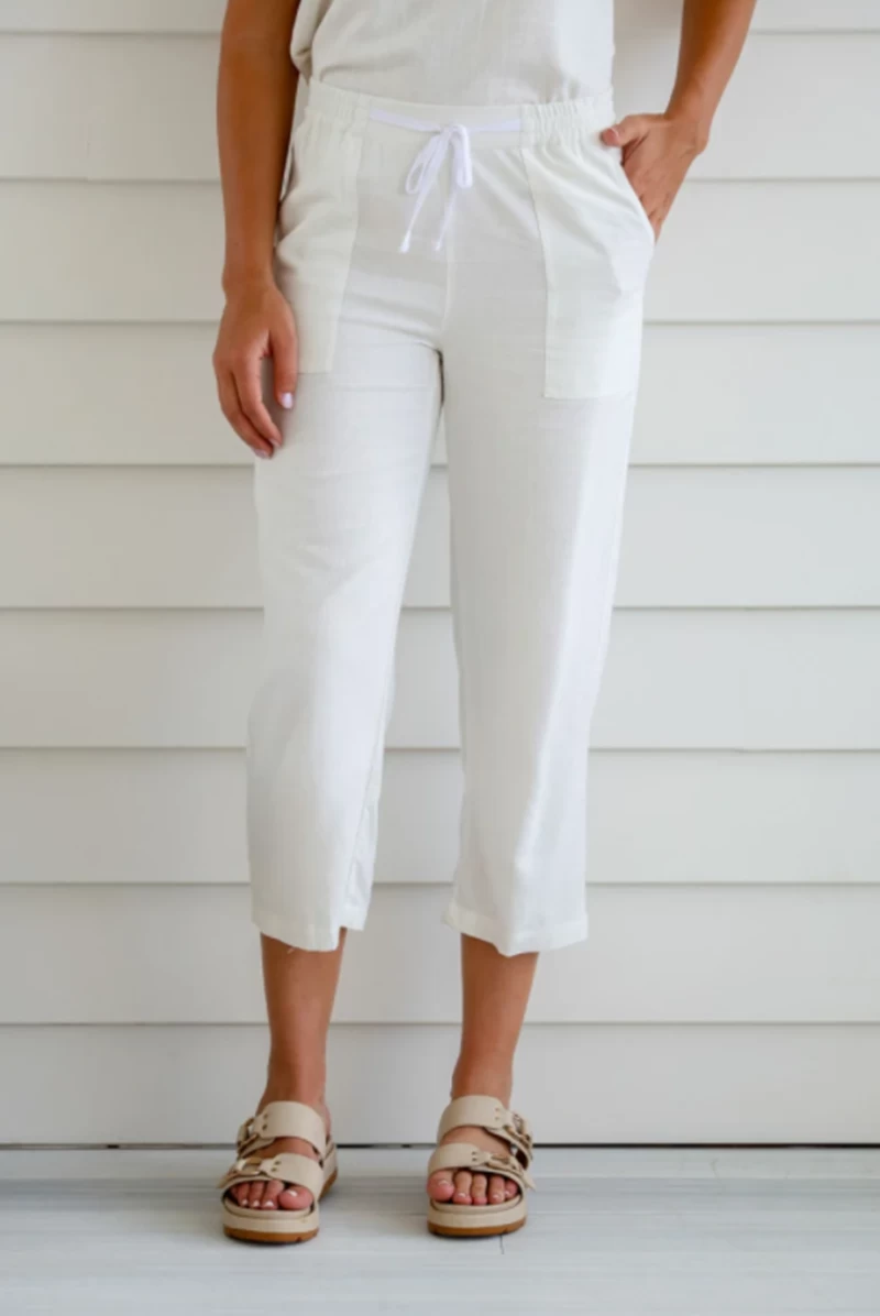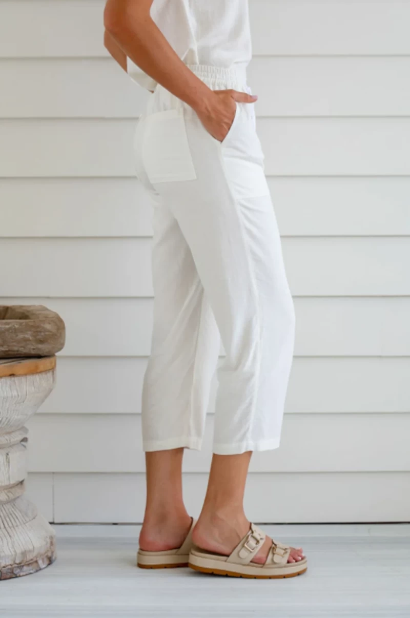 Ladies’ Hemp Cotton 7/8 length elastic waist pants in a crisp White colour.