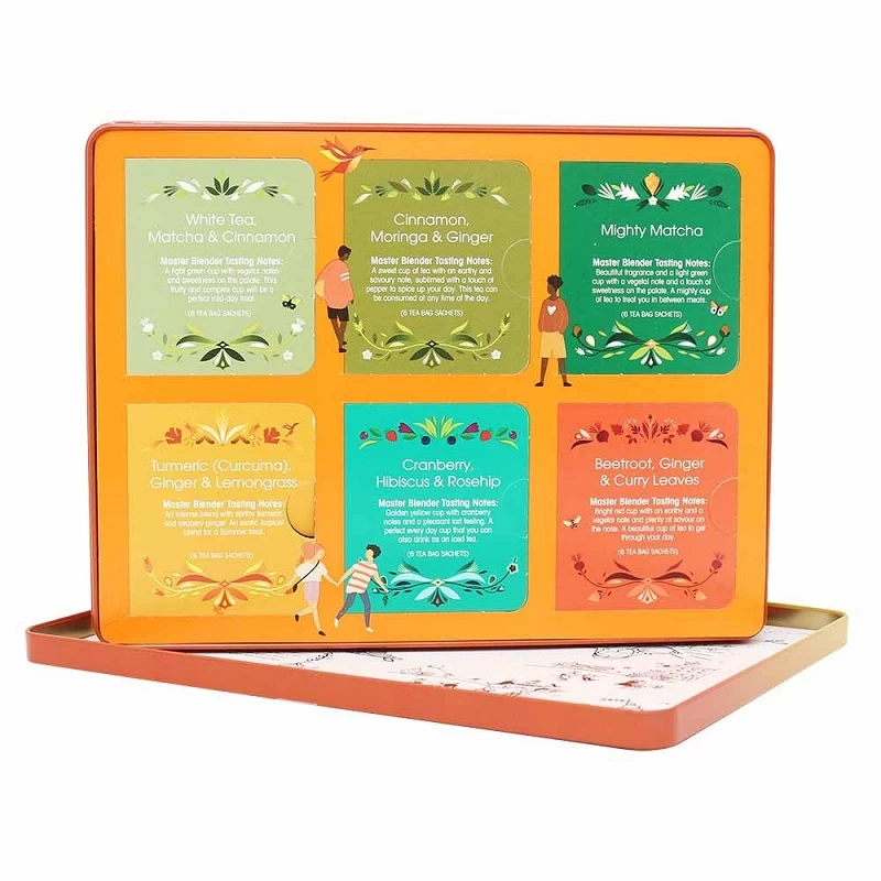 Gift set includes: White Tea, Matcha & Cinnamon, Cinnamon, Moringa and Ginger, Mighty Matcha, Turmeric, Ginger & Lemongrass, Cranberry, Rosehip & Hibiscus, Beetroot, Ginger & Curry Leaves.
