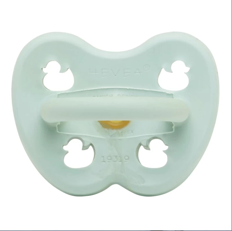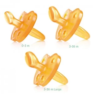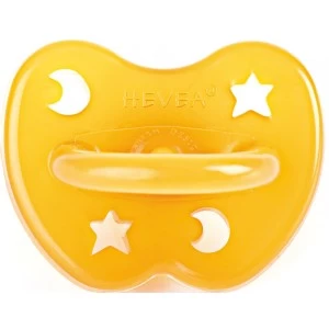 100% natural rubber soother. BPA, phythalate and PVC free. Suitable for ages 0 – 3 months. Orthodontic style, soother slightly slides up into the roof of baby’s mouth. Star and moon shaped ventilation holes on front of soother.