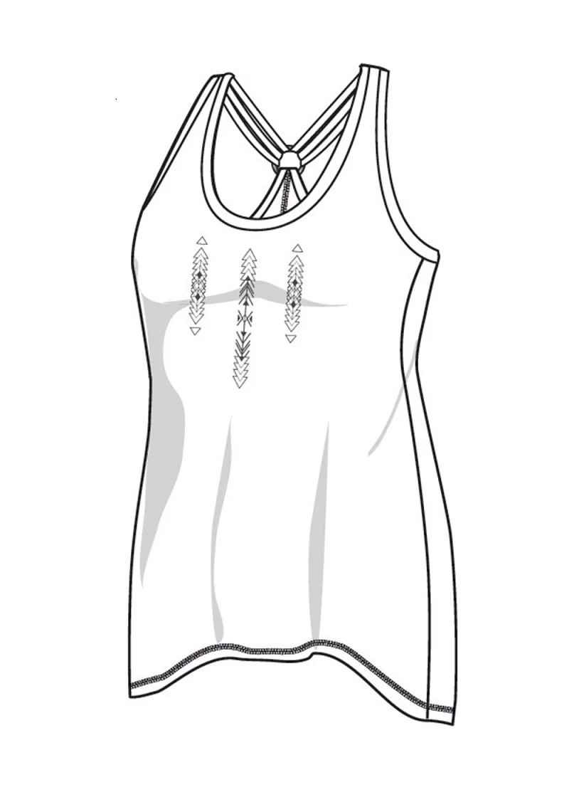 Evolution of cool, this a-line strappy back, looser style tank in organic cotton and bamboo blend will keep you cool while you move this summer. Aztec-style print, O-ring strapped back, and asymmetrical hem take this tank next level. The earth delights to feel your bare feet and the winds long to play with your hair…