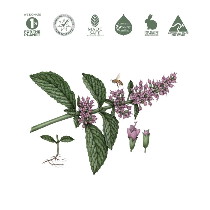 Plant-Based Ingredients: Aqua (purified water), Mentha piperita (Peppermint essential oil), sugar based biodegradable alcohol, plant-based biodegradable surfactant, plant-based biodegradable solubiliser.