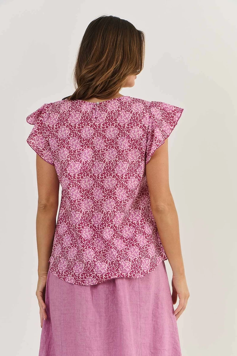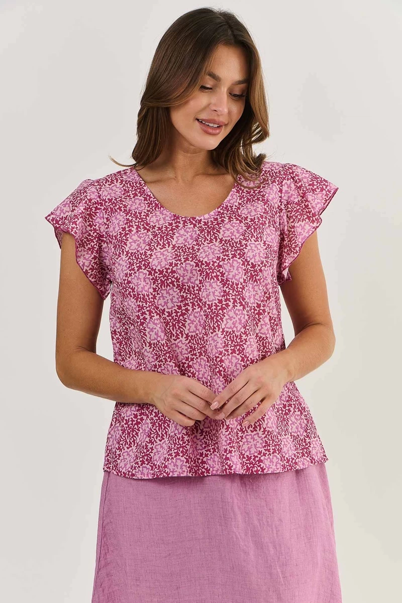 Naturals by O & J Cotton top with Freesia Print. Butterfly sleeves and a scoop neckline make the GA508 the cutest top around. The subtle high-low hem and single shell button back closure are small details that elevate this beautiful and versatile top.
