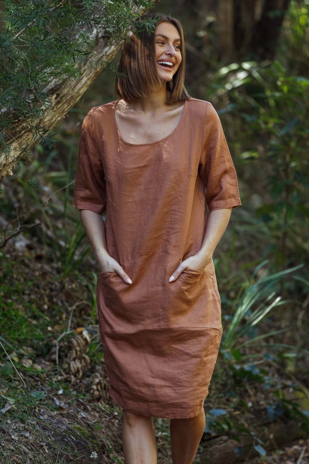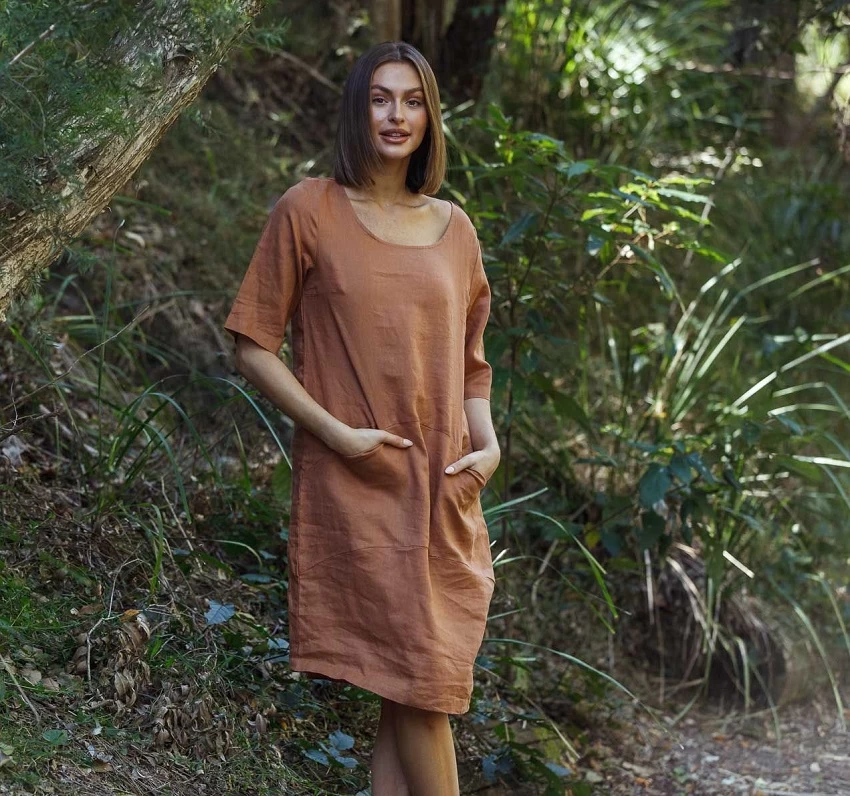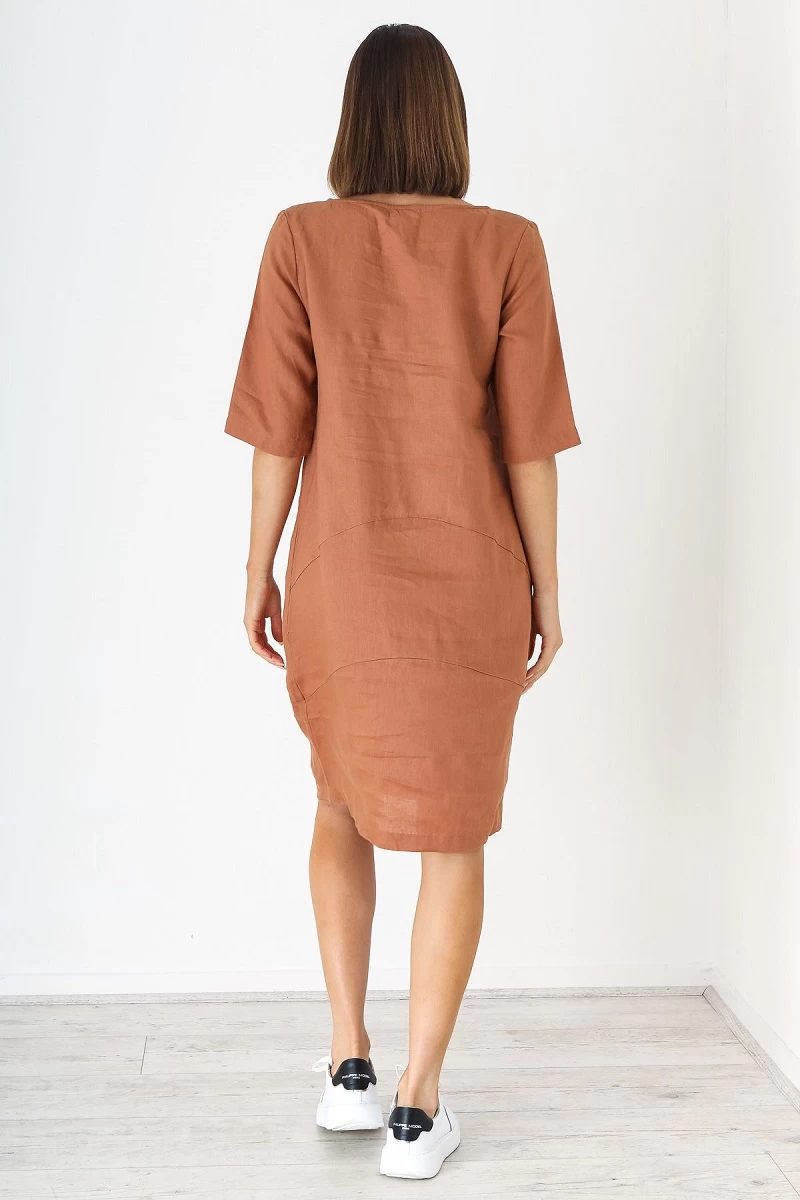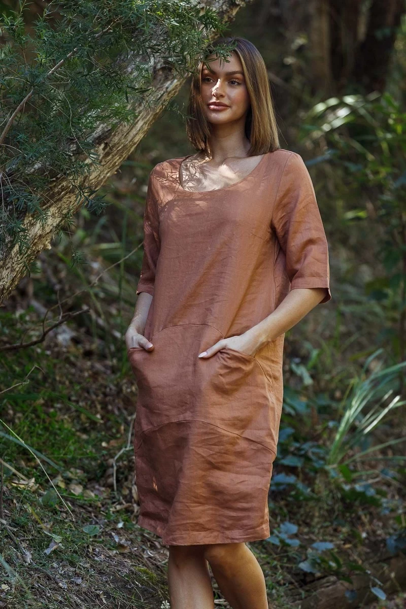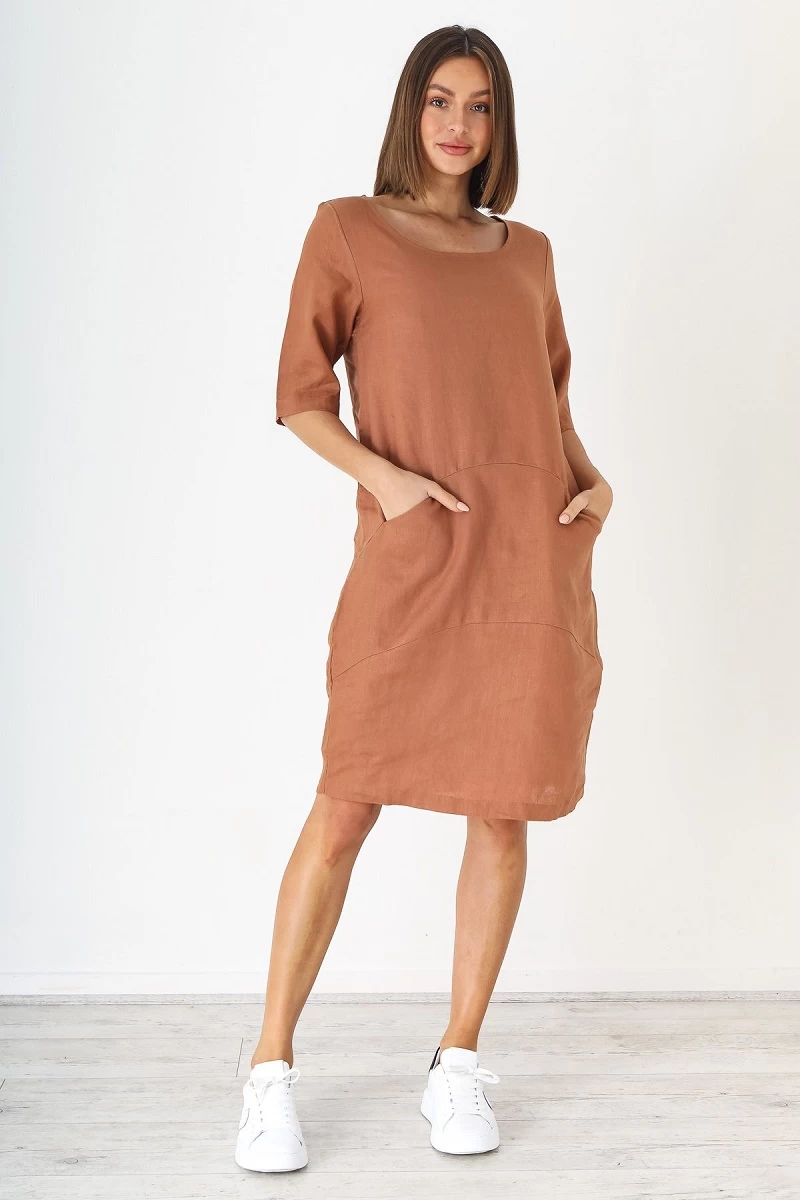 Relaxed style dress with 3/4 sleeves and front pockets in a soft Mocha colour from Naturals by O & J.
