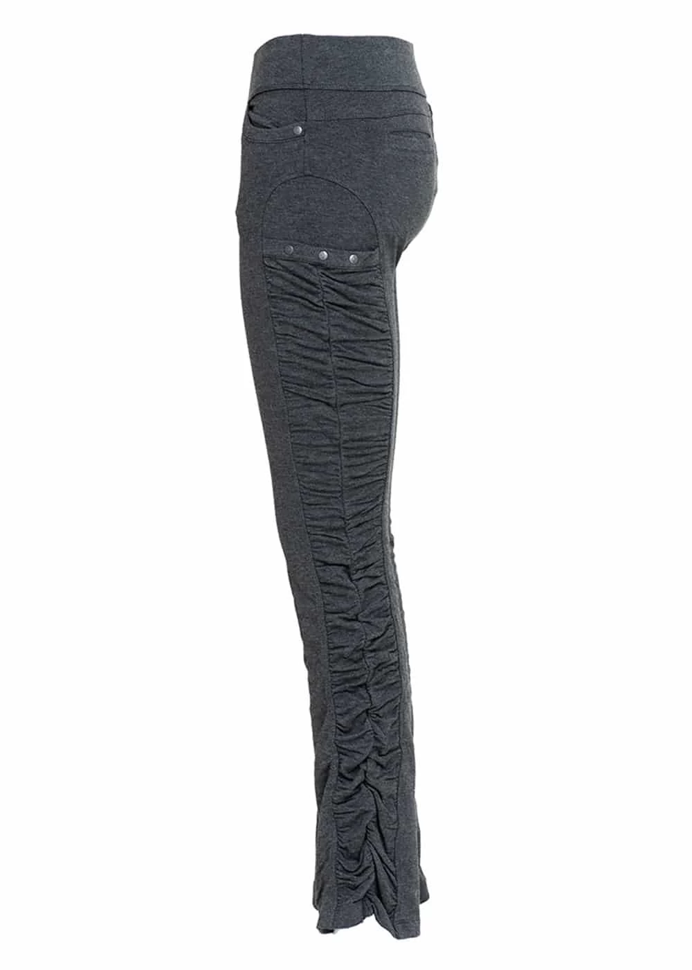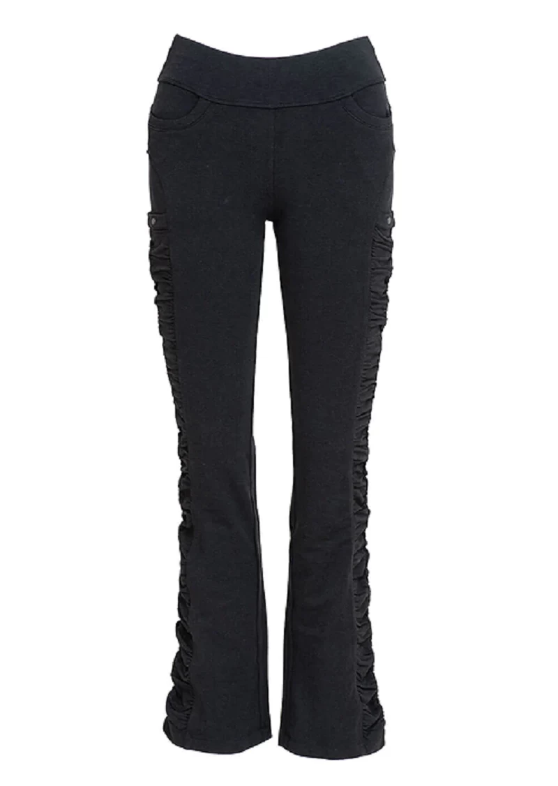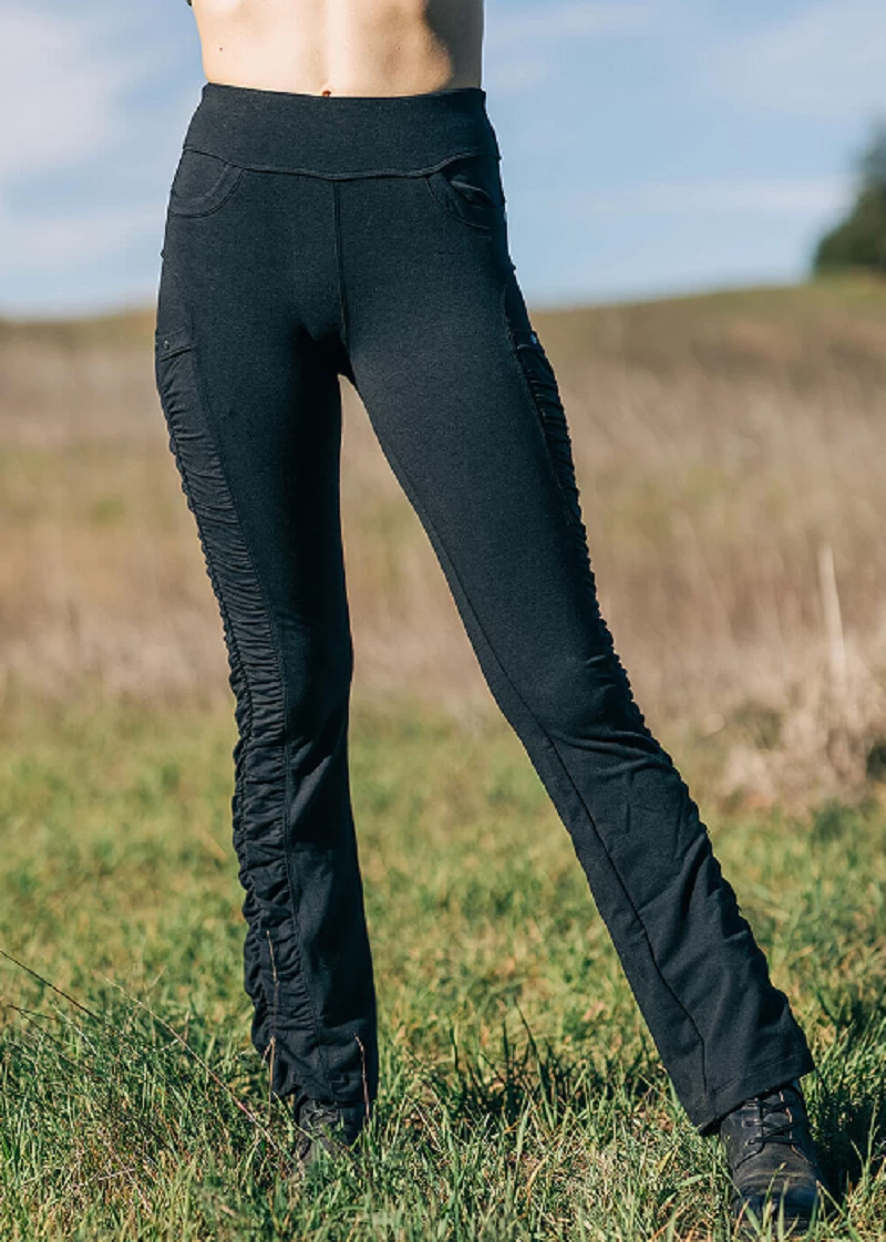 When you need all the ruching you can get, our Triumph Pants in bamboo & organic cotton melange have got you covered. Back by popular demand, these pants are a reboot of the Synergy Pants without the skirt. Like flamenco cargo pants for space travel there are six pockets – including side pockets big enough for any phone (unless you are still rocking a home phone from the 80’s), and three rivets per side. In plain black. Lay it on the line, and never surrender.