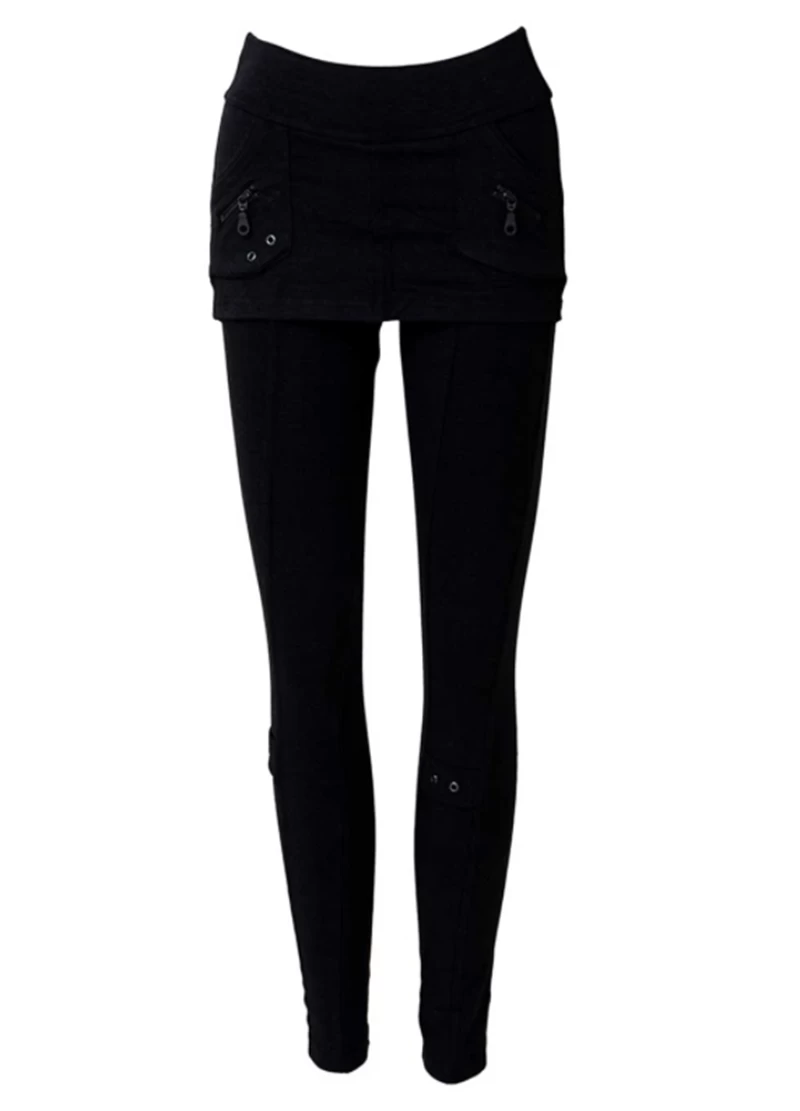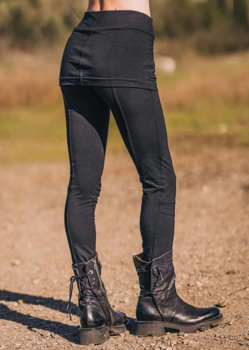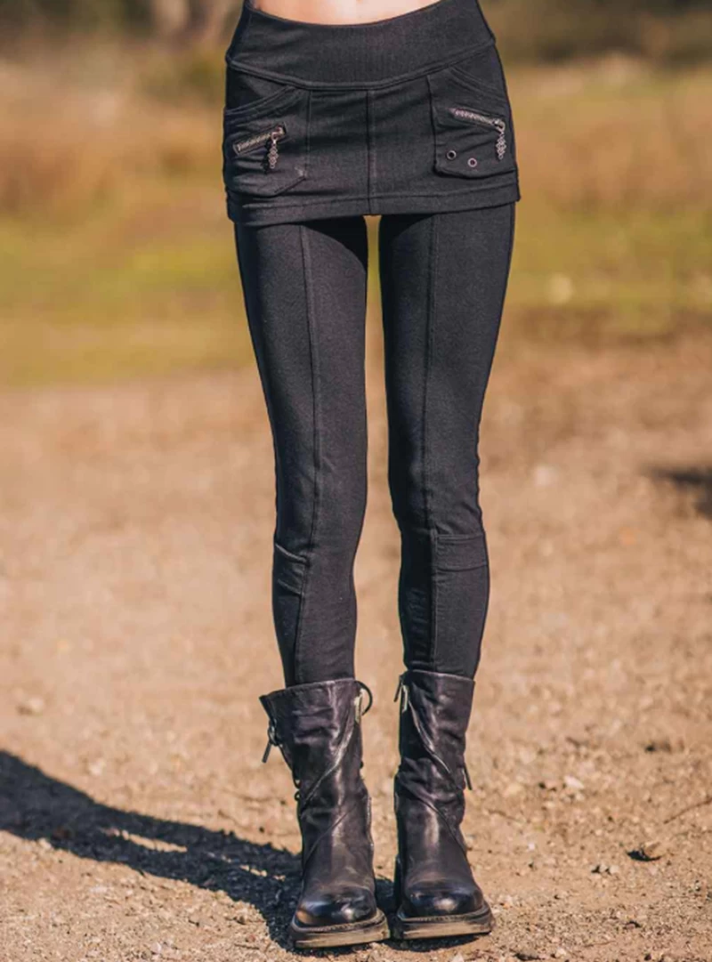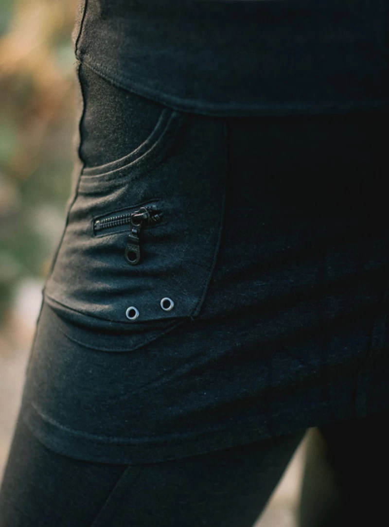 Go where others fear to tread in Nomads newest leggings, with a cargo skirt in thicker organic cotton and bamboo. Perfect with cropped tops, the leggings have slimming pinstripe suit seams down the legs with knife-holster tabs at the calf. Mini cargo skirt/utility belt has two zippered pockets with rivets and Nomads pull tabs, just the right size for your ninja throwing stars, or sequined glitter depending on your weapon of choice. At Nomads we always choose love.