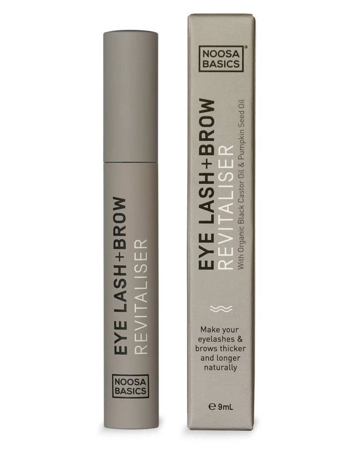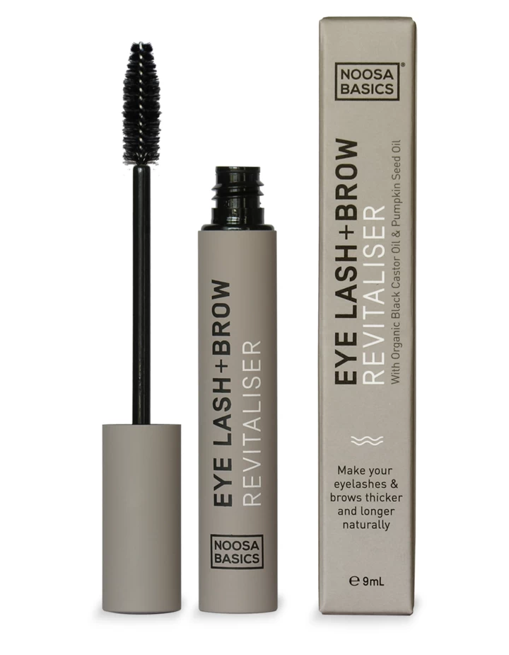 Noosa Basics Eye Lash + Brow Revitaliser with Vitamin E rich Flaxseed Oil and Black Castor Oil oil alongside regular Castor oil (from the bean of the Castor plant), Pumpkin Seed oil and Grapeseed oil to help nourish and strengthen eyebrows and lashes naturally!