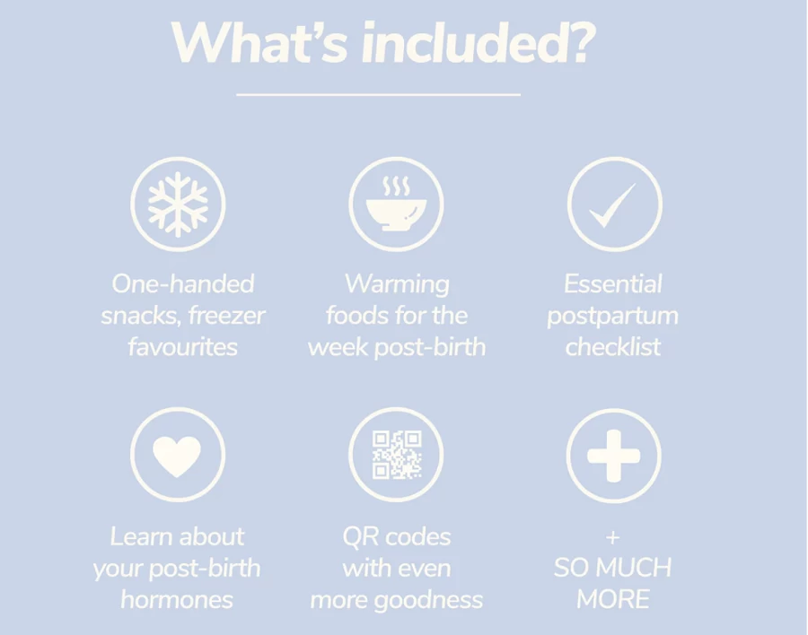 ✓ One-handed snacks, freezer favourites and warming meals loaded with nourishment for the week post-birth.