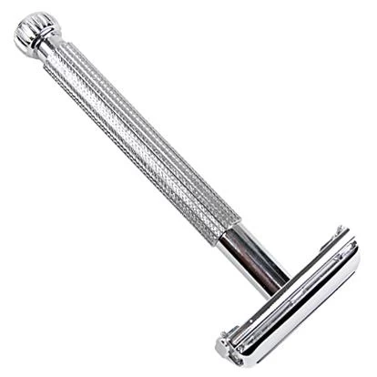 This safety razor is designed for women. The long, thin decorative handle is excellent for women who prefer a double edge safety razor. It has a textured handle making it easy to hold in the shower. With a traditional butterfly, twist-to-open, design this razor will deliver a smooth shave when used with a quality blade. Blades need to be purchased separately. Can be used with Shark or Astra Blades.