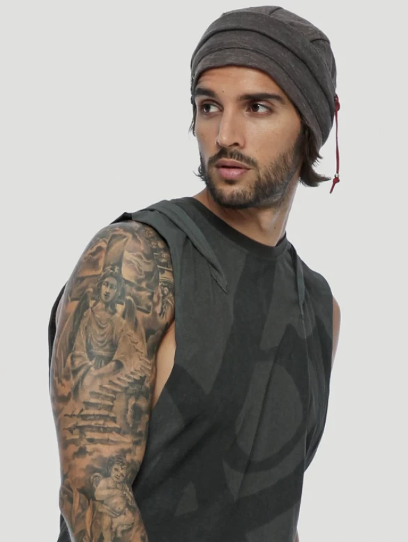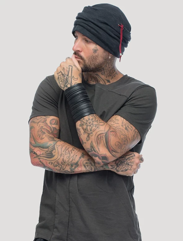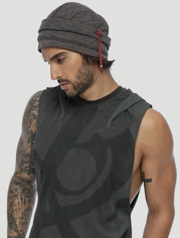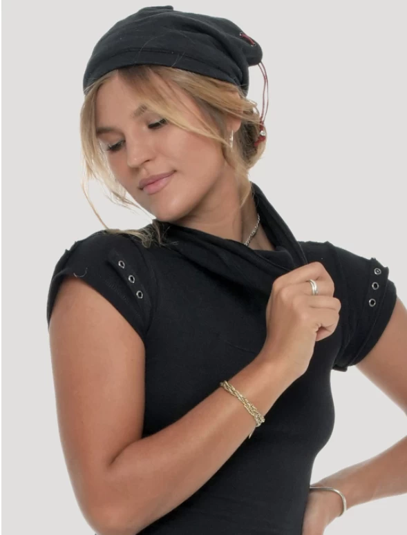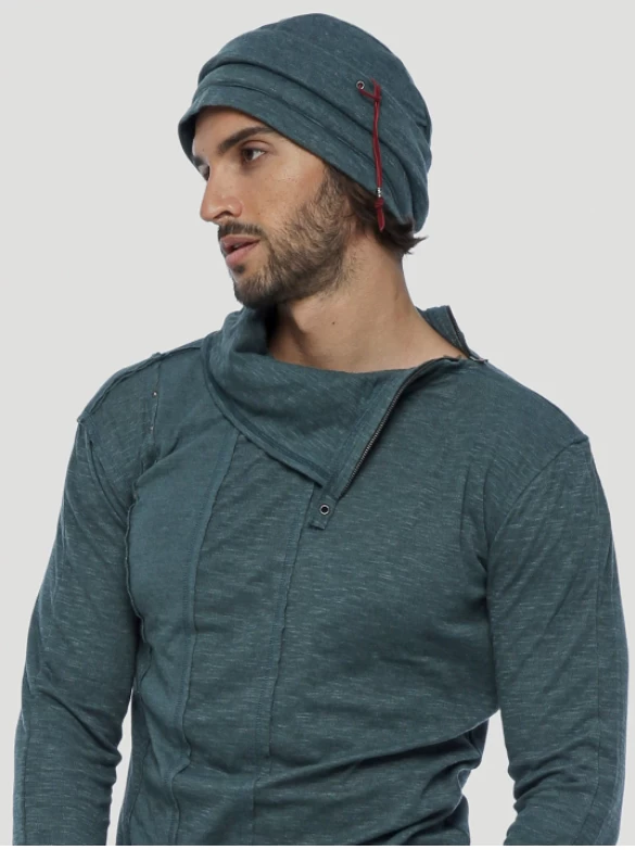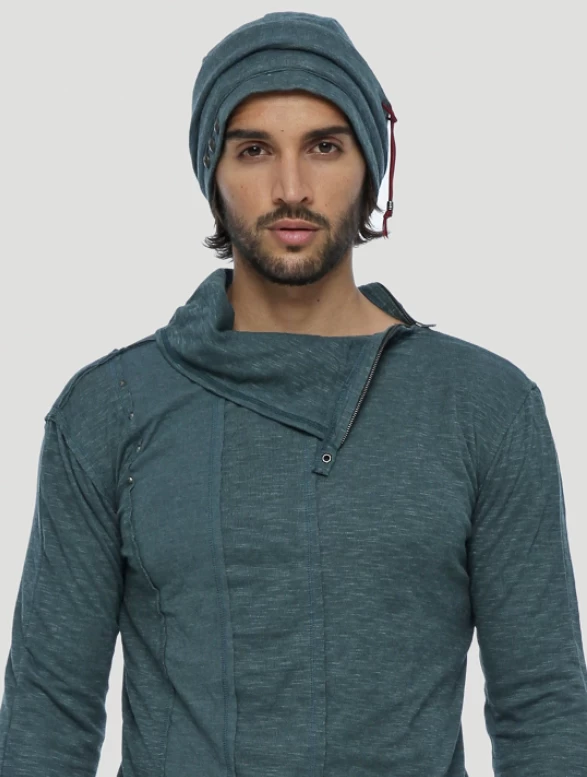 A turban-style, unisex beanie hat with a strap and custom-made metal bead decoration. Made of heavenly soft, comfortable and stretchable, double-knitted fabric. Will keep you nice and cosy without overheating. Three Panel design gives shape and fullness. Covered overlap fabric assures a comfortable fit and ways to wear in different combinations, as you prefer. With its functional properties, this modern turban is a proven practical companion for everyday life.