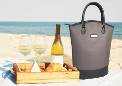 The tote features a secure zipper pocket, convenient for holding a wine opener or keys.