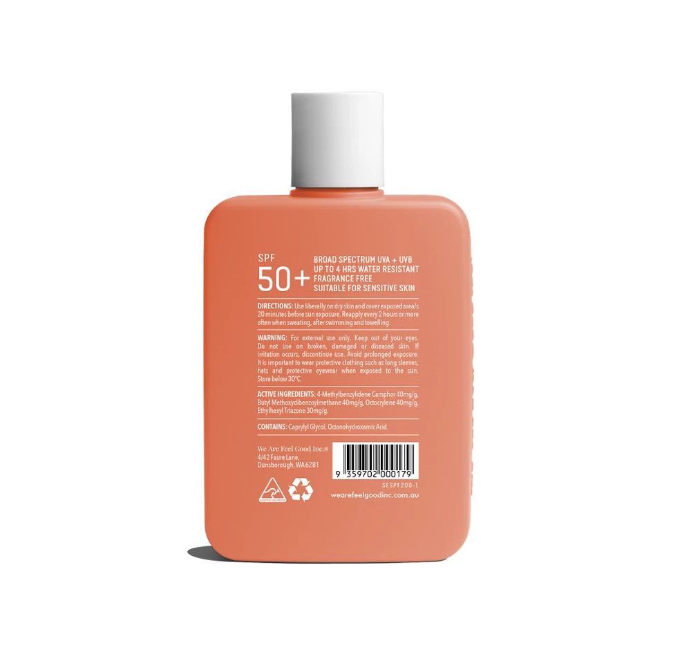 Use We Are Feel Good Inc Sensitive Sunscreen liberally on dry skin and cover exposed areas 20 minutes before sun exposure. Reapply every 2 hours or more often when sweating, and after swimming or towelling. For external use only. Keep out of your eyes. Do not use on damaged or diseased skin. If irritation occurs, discontinue use. Avoid prolonged exposure. It is important to wear protective clothing such as long sleeves, hats and protective eyewear when exposed to the sun. Use under makeup or alone. Store below 30˚C.