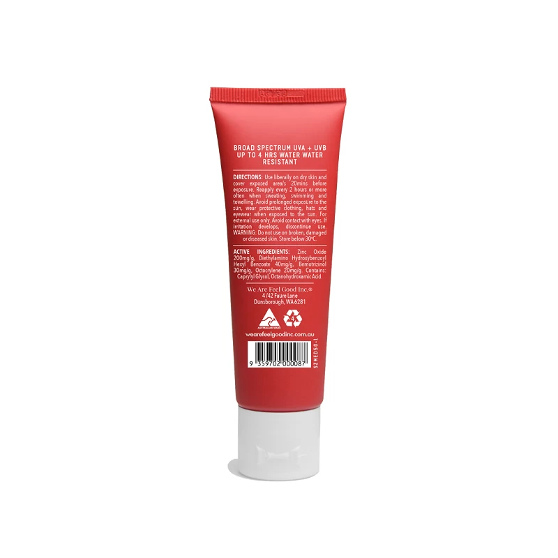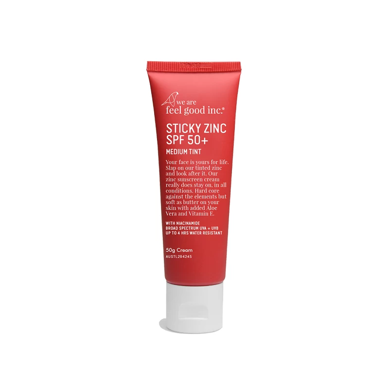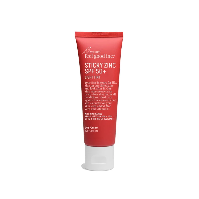 We Are Feel Good Inc Sticky Zinc SPF 50+ is broad spectrum and up to 4 hours water resistant, with added Niacinamide (Vitamin B3) and anti-inflammatory properties of Aloe Vera and Vitamin E. Available in 2 options, light & medium colour tint, so it works well as a BB cream or in place of foundation when you want to even out your skin tone. Hardcore against the elements, but soft on your skin (plus, it really does stay on and protect your skin in all conditions)!